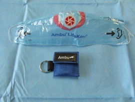 In einem Schlüsselanhänger verpackte Folie mit Befestigungsschlaufen, die über die Ohren des Patienten gezogen werden. Die Folie liegt auf dem Gesicht und wird bei Mund-zu-Mund oder Mund-zu-Nase-Beatmung eingesetzt.