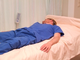 Der Oberkörper wird vorsichtig abgelegt, besondere Vorsicht gilt dabei dem Kopf des Patienten.