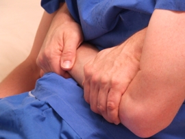 Der Helfer greift von hinten den Unterarm des Patienten,